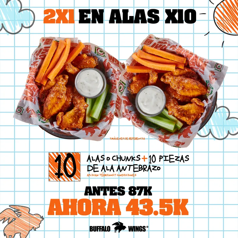 -Aplica para alas tradicionales, chunks o alas apanadas en todas nuestras salsas (sujetas a disponibilidad).