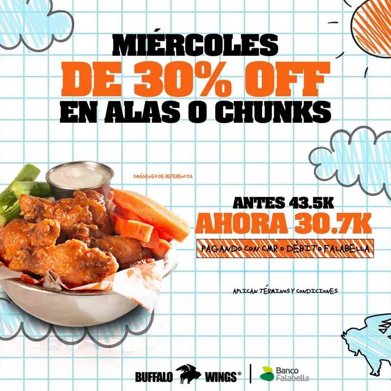 ¿QUÉ?: 30% OFF en alas x10 o chunks x10 los miércoles pagando con CMR o débito Falabella durante el mes de Abril de 2026.