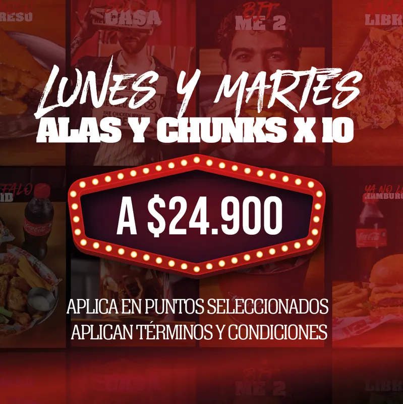 ¿QUÉ?: Alas x10 o chunks x10 a $24.900 los lunes y martes del mes de noviembre de 2025.