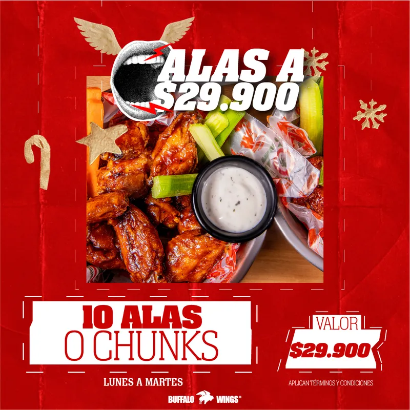 ¿QUÉ?: Alas x10 o chunks x10 a $24.900 los lunes, martes del mes de diciembre de 2025.