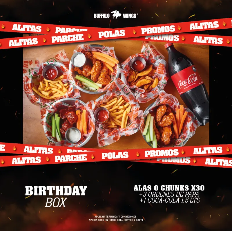 ¿Qué?: Alas o chunks, 30 piezas, zanahoria, apio, salsa ranch, 3 porciones de papas y Coca-Cola 1.5L o 3 cervezas budweiser (a elección), por: $139.000 (Página web y WhatsApp).