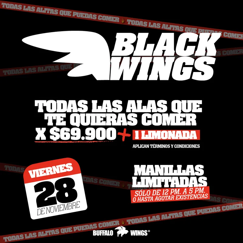 ¿QUÉ?: En noviembre, cuando decimos que somos más hot que la 911, no es cualquier frase: es nuestro ADN. Por eso, llega Black Wings: (todas las alas o chunks que te puedas comer) + 1 limonada por 69.900 por persona, este viernes 28 de noviembre del 2025.