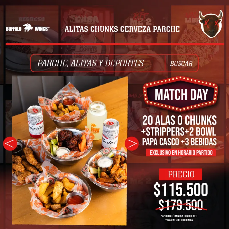 ¿Qué?: 20 alas o chunks + 2 bowl papa casco + strippers + 3 bebidas por $115.500 cop.