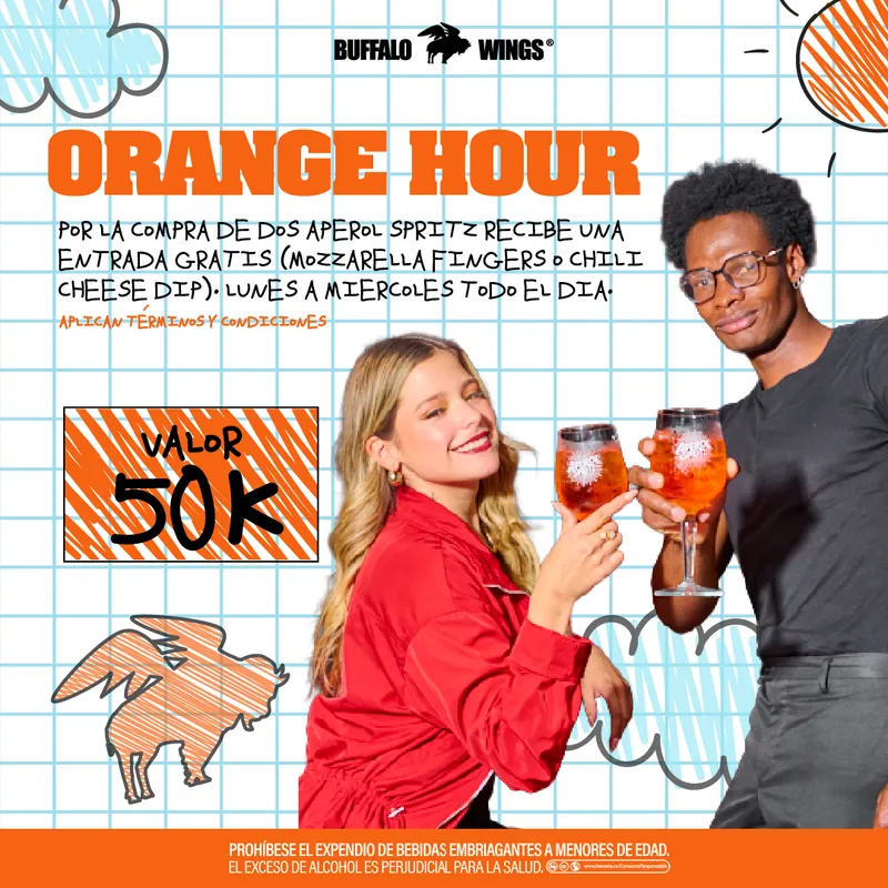¿Qué?: Por la compra de dos (2) aperol spritz recibe una entrada gratis (Mozzarella Fingers o Chili cheese dip).