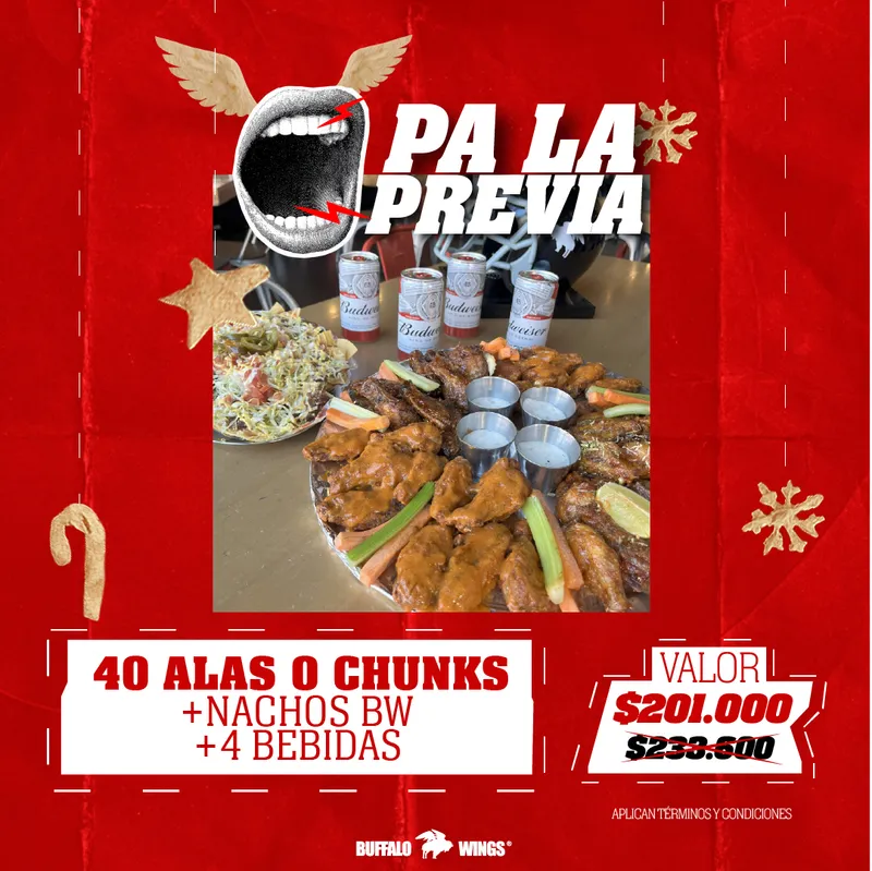 40 Alitas + Nachos BW + 4 Bebidas por $201.000.