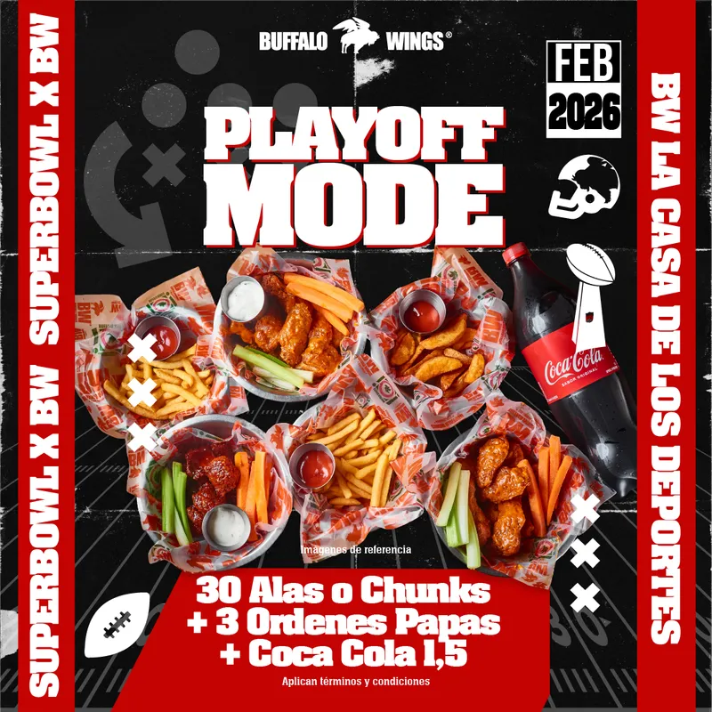 Alas o chunks, 30 piezas, zanahoria, apio, salsa ranch, 3 porciones de papas y Coca-Cola 1.5L o 3 cervezas Budweiser (a elección), por: $139.000 (Página web, teléfono fijo y WhatsApp).