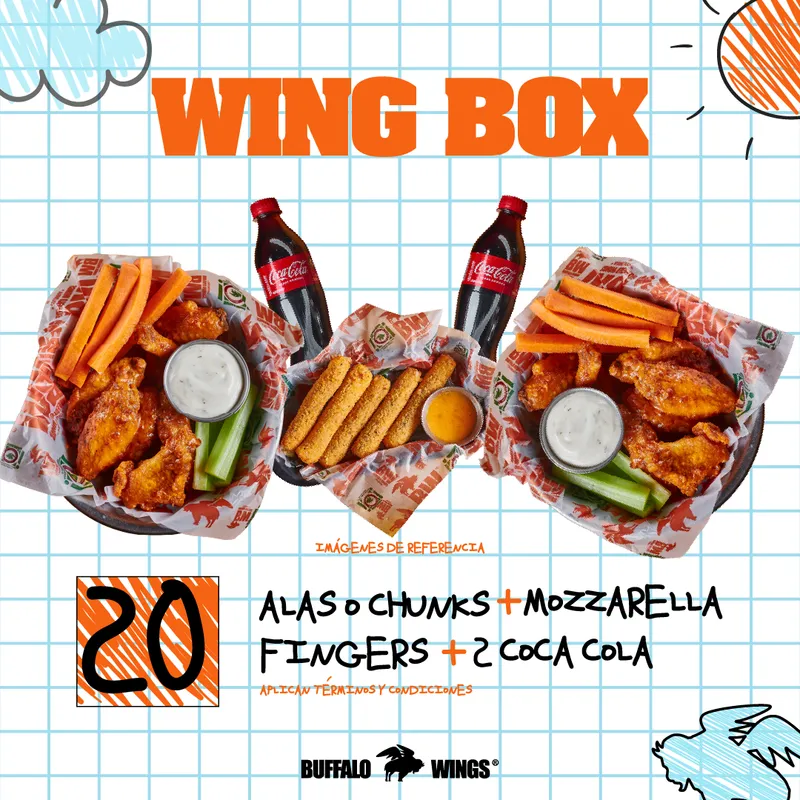 ¿Qué?: Alas x 10 + chunks x10 + Dedos mozzarella + 2 Coca-Cola por $110.500 (Justo), $115.800 (Rappi).